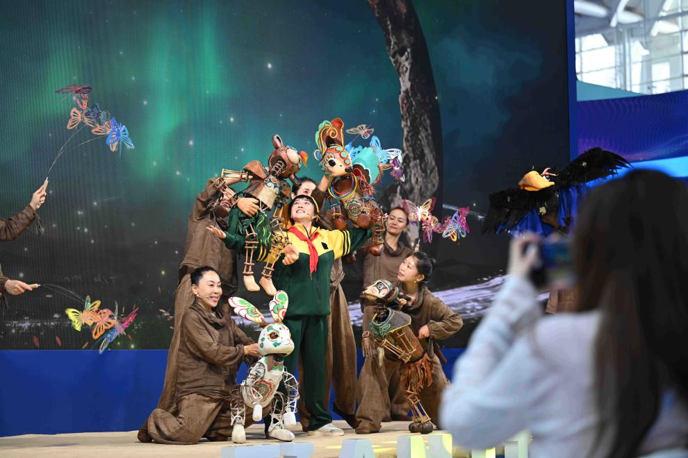 2024中國文化旅游產(chǎn)業(yè)博覽會上,中國首部XR數(shù)字音樂兒童劇《敦煌·九色鹿王》在博覽會天津河西展區(qū)表演。新華社記者 孫凡越 攝