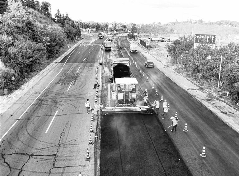 8月13日,在G320國(guó)道橫峰縣司鋪鄉(xiāng)段路面功能性改造工程施工現(xiàn)場(chǎng),橫峰公路中心養(yǎng)護(hù)工人頭頂烈日,配合攤鋪機(jī)對(duì)路面的瀝青混合料進(jìn)行攤鋪平整。侯先鋼 攝