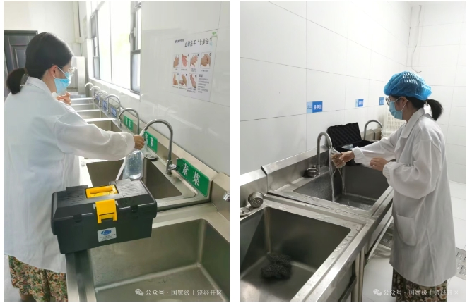 行動過程中,工作人員深入經(jīng)開中學(xué)、興園學(xué)校、實(shí)驗(yàn)幼兒園、實(shí)驗(yàn)小學(xué)等學(xué)校,采用“現(xiàn)場快檢+實(shí)驗(yàn)室深檢”雙軌并行的模式,對余氯(二氧化氯)、色度、渾濁度、菌落總數(shù)、總大腸菌群等8項(xiàng)關(guān)鍵指標(biāo)進(jìn)行快速檢測,實(shí)時記錄數(shù)據(jù)并同步分析。同時,嚴(yán)格執(zhí)行水樣采集流程,將標(biāo)本密封帶回實(shí)驗(yàn)室進(jìn)行全項(xiàng)檢測,切實(shí)做到檢測覆蓋全、風(fēng)險(xiǎn)無遺漏。