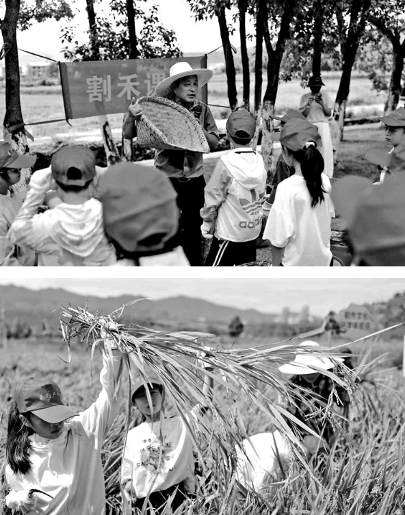 研學(xué)中,孩子們?cè)趯I(yè)老師指導(dǎo)下小心翼翼割下稻穗,并利用傳統(tǒng)農(nóng)具禾斛脫粒,近距離感受千年稻作文化的鮮活氣息。