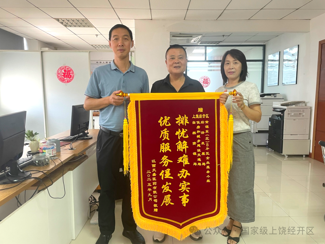 “非常感謝你們的高效服務(wù),為我們解決了多年來的難題,也讓我們企業(yè)發(fā)展更有信心了?!?月25日,江西天盛醫(yī)藥有限公司負(fù)責(zé)人來到上饒經(jīng)開區(qū),鄭重地將一面印有“排憂解難辦實(shí)事,優(yōu)質(zhì)服務(wù)促發(fā)展”的錦旗送到了區(qū)經(jīng)發(fā)局、住建交局、自然資源局和片區(qū)企業(yè)服務(wù)小組干部的手中。
