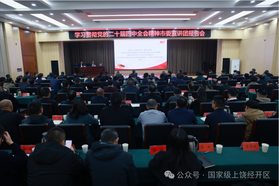 根據(jù)市委統(tǒng)一安排,11月26日,學(xué)習(xí)貫徹黨的二十屆四中全會精神市委宣講團報告會在上饒經(jīng)開區(qū)舉行。市委宣講團成員,市發(fā)改委黨組書記、主任張小龍作宣講報告。區(qū)黨工委副書記、管委會主任劉加豐主持報告會,區(qū)領(lǐng)導(dǎo)江新煒、葉建國、姜健、齊小鵬、葉小麗參加。