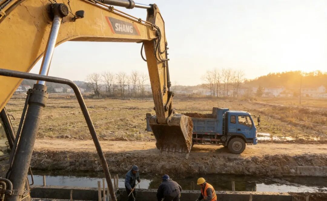 冬日暖陽下,玉山縣四股橋鄉(xiāng)四股橋村的高標(biāo)準(zhǔn)農(nóng)田建設(shè)現(xiàn)場一派熱火朝天的繁忙景象。挖掘機(jī)鐵臂揮舞,來回穿梭平整土地;工程車輛滿載砂石水泥,駛向田間道路修建點位;工人們正忙著襯砌灌溉水渠,一條條筆直的溝渠在田野間延伸,勾勒出穩(wěn)產(chǎn)高產(chǎn)的希望輪廓。