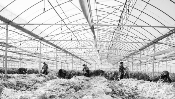1月15日,在橫峰縣岑陽(yáng)鎮(zhèn)岑港村雪里紅種植大棚里,十幾名村民正熟練地收割成熟的雪里紅。