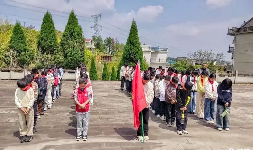 4月2日清晨,同學(xué)們身著整齊校服、佩戴鮮艷紅領(lǐng)巾,列隊(duì)有序前往紀(jì)念塔。活動前,大家主動清理塔區(qū)灰塵與雜草,以實(shí)際行動寄托哀思。儀式上,校長深情致辭,講述活動意義;少先隊(duì)員代表發(fā)言,立下傳承遺志的誓言。校領(lǐng)導(dǎo)與隊(duì)員依次敬獻(xiàn)花束,全體師生默哀三分鐘,隨后緩緩繞塔一周,緬懷革命先烈。