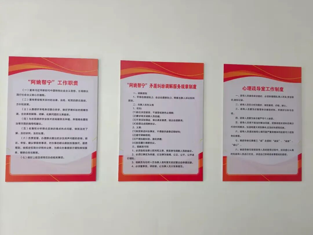 服務站以“1234”工作法為抓手,構建起“收集-分類-辦理-督辦”的一套流程。“一個陣地服務”,依托“阿姚幫寧”服務站平臺,專人負責志愿服務工作,作為全鄉(xiāng)服務群眾、化解矛盾的社會載體,以“我要幫你”為初心承諾,讓群眾訴求有處可提、難題有人可解?!皟煞N渠道納訴”,開通群眾現(xiàn)場訴求、電話微信訴求兩種渠道,打破時空限制,方便群眾隨時隨地反映問題,確保訴求收集無死角、全覆蓋。“三類問題收集”,聚焦村里事、鄰里事、家里事三類突出問題精準發(fā)力——村里事涵蓋政事、商事、文事;鄰里事聚焦突發(fā)事件、積怨矛盾、誘發(fā)事件;家里事關注情感糾紛、經濟困難、生活難題,實現(xiàn)問題分類施策、精準破解?!八膶訖C制解難”,現(xiàn)場直辦——對簡單訴求、微矛盾,當場受理、當場解決,提升服務效率;網格員領辦——對復雜問題,由鄉(xiāng)村網格員牽頭領辦,限時辦結,確?!靶∈虏怀龃濉?;鄉(xiāng)村聯(lián)辦——對涉及面廣、難度大的事項,由鄉(xiāng)黨委、政府聯(lián)合司法所、派出所等部門協(xié)同辦理,凝聚治理合力;跟蹤督辦——所有事項建立臺賬,做好回訪記錄,確?!笆率掠谢匾簟⒓兄洹?。
