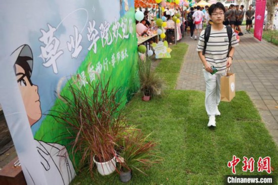 新生從展示的草皮上走過(guò),該草種為南京農(nóng)業(yè)大學(xué)草坪科學(xué)與管理團(tuán)隊(duì)自主培育的藍(lán)光中華結(jié)縷草,葉寬中等,葉色藍(lán)綠,觀賞度高,且耐踐踏,抗旱性強(qiáng),抗病蟲能力強(qiáng)。 泱波 攝