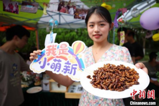 南京農(nóng)業(yè)大學(xué)植保學(xué)院志愿者展示可食用的昆蟲迎接新生。 泱波 攝