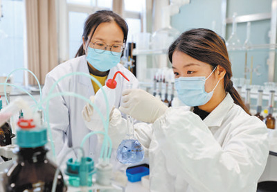 山東省棗莊市西王莊鎮(zhèn)一個實驗室內,碩士研究生晁齊齊(右)在做化學實驗。