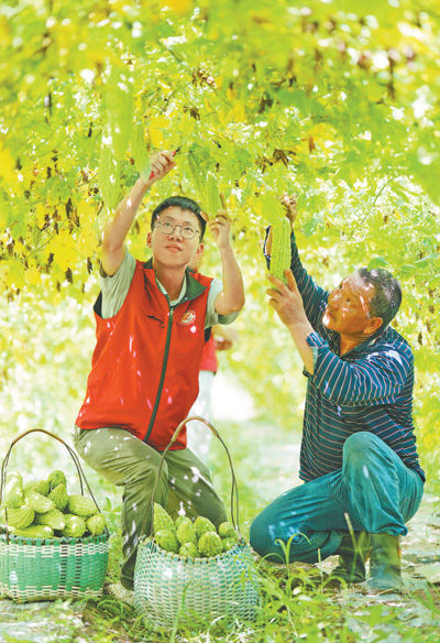 廣西壯族自治區(qū)靈川縣靈田鎮(zhèn)東田村,來自山東大學的博士研究生羅雯耀(左)在幫村民采摘。
