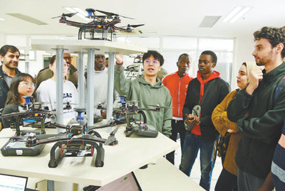 江蘇大學第四屆計算機文化節(jié)上,外國留學生在了解無人機功能和運行原理。