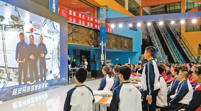 陜西延安科技館“天宮課堂”第四課地面課堂,學生在向航天員提問。