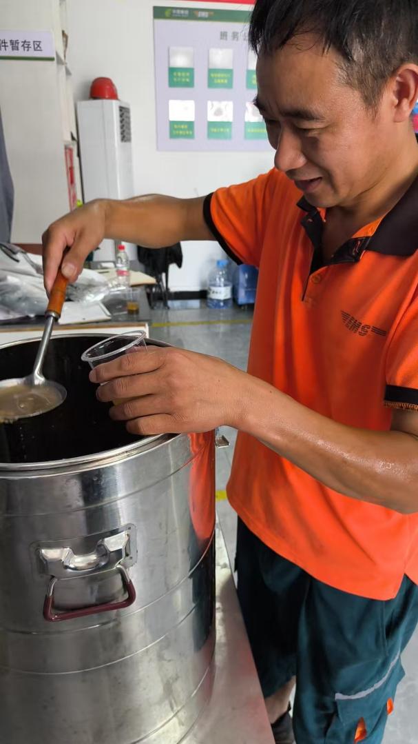 傍晚六點,夕陽的余暉將天空染成了橘紅色,但空氣里的熱度絲毫未減。投遞員付志森回到部站,拿起鐵勺裝起一杯綠豆湯,冰涼的水流過喉嚨,瞬間驅散了不少燥熱。
