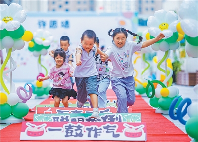 圖為8月31日,江蘇省宿遷市宿城區(qū)南師附中宿遷分校幼兒園,小朋友們跨越“成長跨欄”,喜迎新學期。