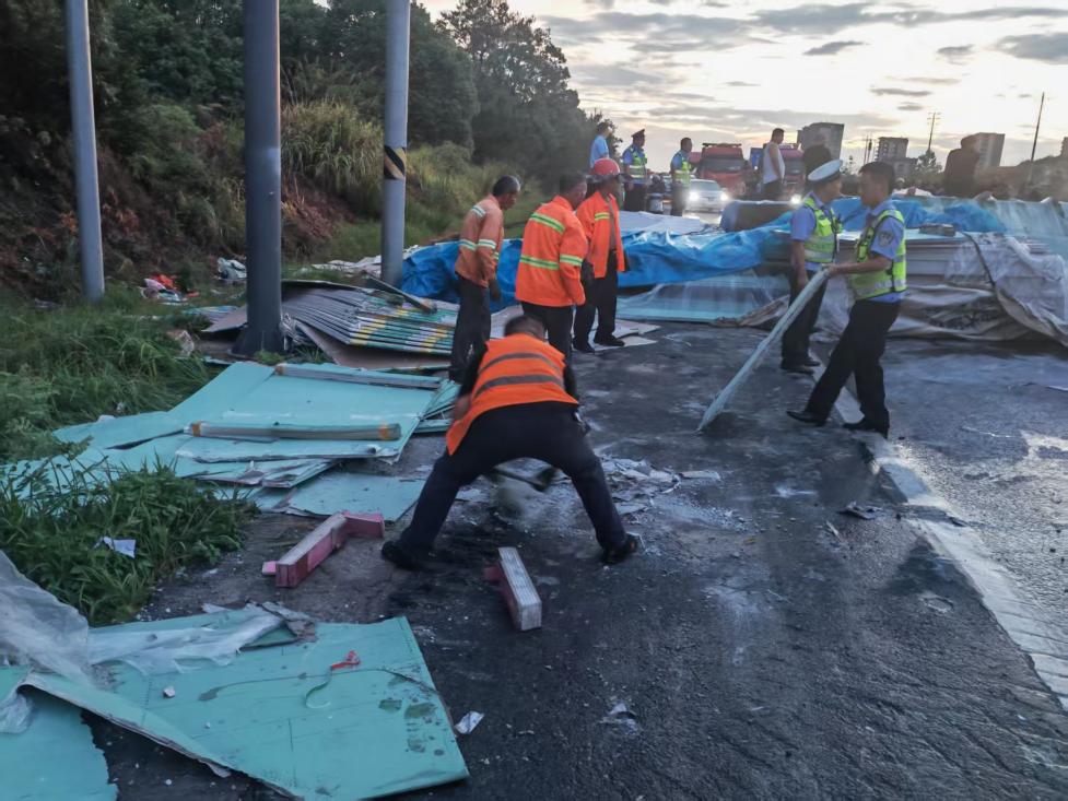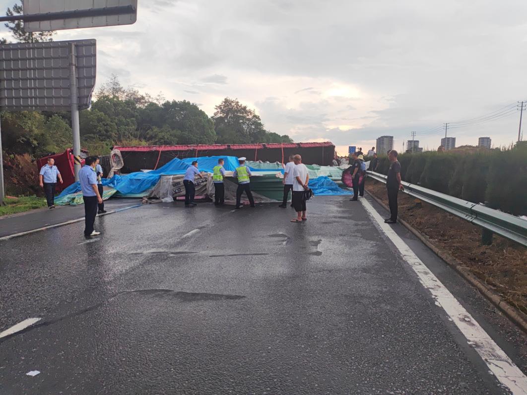 9月8日下午4點(diǎn)30分許,上饒市信州區(qū)突發(fā)短時(shí)強(qiáng)降雨,G320國道廣信區(qū)往信州區(qū)距機(jī)場大道路口200米處一輛滿載貨物的重型貨車失控側(cè)翻,車廂內(nèi)部分貨物散落至路面,瞬間造成交通中斷,散落的貨物還形成了影響后續(xù)車輛通行的“移動(dòng)障礙”,存在二次事故隱患。