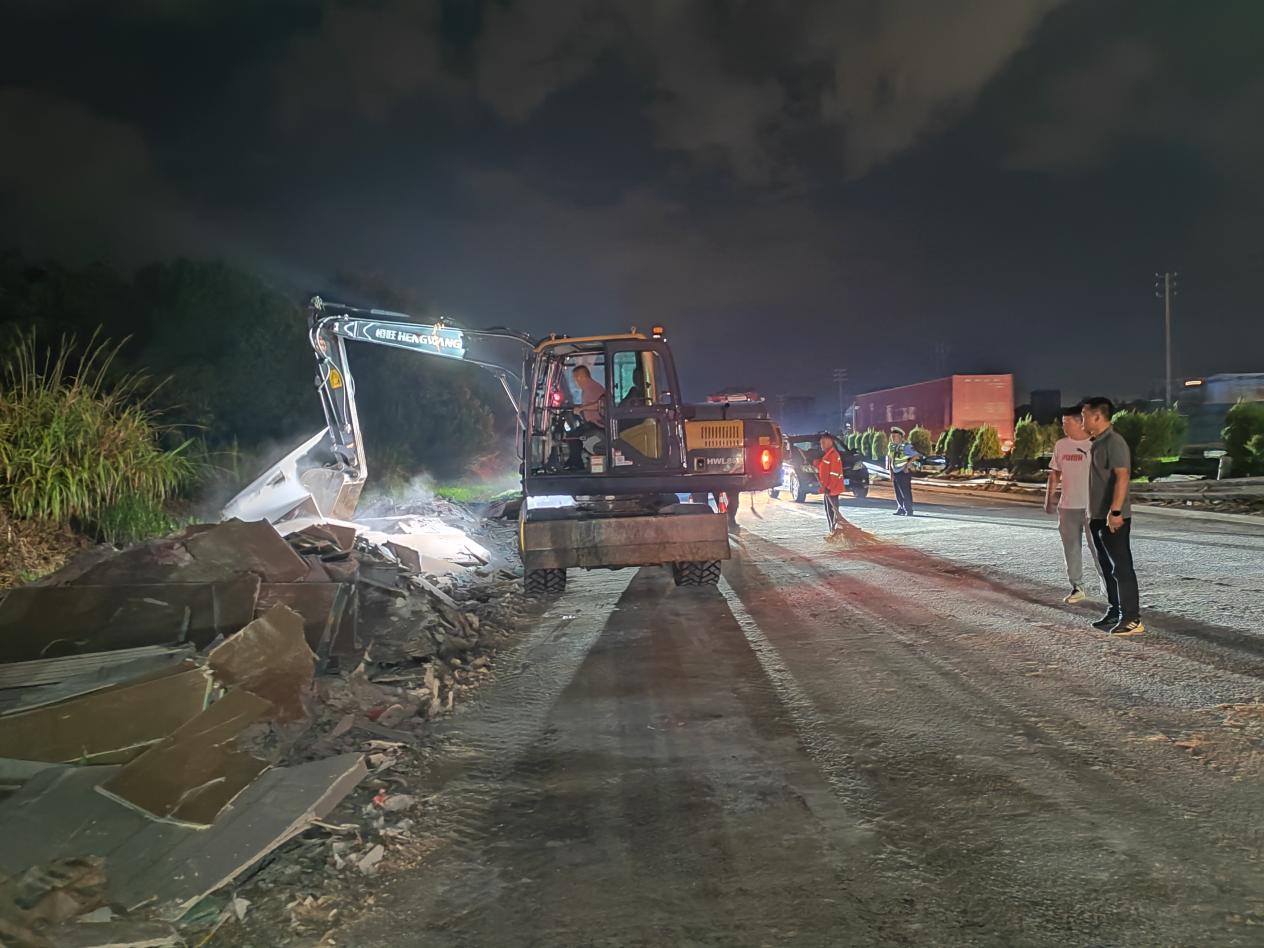 接到交警部門聯(lián)動(dòng)通知后,信州公路事業(yè)發(fā)展中心養(yǎng)護(hù)應(yīng)急隊(duì)伍迅速響應(yīng),組織出動(dòng)挖掘機(jī)1臺,養(yǎng)護(hù)作業(yè)人員5名,安全警示設(shè)施若干抵達(dá)現(xiàn)場。抵達(dá)后,工作人員第一時(shí)間與交警部門對接分工,配合交警部門專業(yè)清障隊(duì)伍進(jìn)行障礙物清理,聚焦“快速清障、恢復(fù)通行”,通過挖掘機(jī)將路面上散落的貨物轉(zhuǎn)移至臨時(shí)區(qū)域,再組織人員用鐵鍬、掃帚對路面散落的包裝碎片、貨物殘?jiān)M(jìn)行全面清掃,同時(shí)檢查路面是否因貨車側(cè)翻出現(xiàn)破損,確保清理后的路面符合安全通行標(biāo)準(zhǔn)。