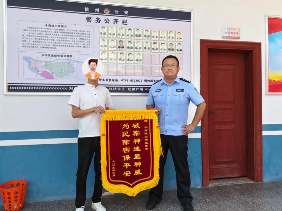9月6日,為表達對水南派出所民警高效辦案效率和熱情服務(wù)態(tài)度的感激之情,陳先生特意制作了一面寫有“破案神速顯神威,為民除害保平安”的錦旗,送至水南派出所?!澳銈冞@辦案效率太快了!真的太感謝你們了,幫我及時追回了財物?!标愊壬罩窬氖郑拥卣f道。