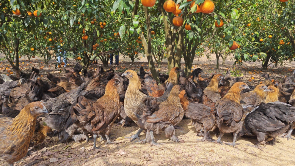 “媽媽你看,這個橘子像小燈籠!黃澄澄的顏色真好看!”金秋十月,在上饒市廣信區(qū)黃沙嶺鄉(xiāng)中洲村橘園,程仕騫小朋友拉著媽媽的手,興奮地穿行在碩果滿枝的果樹間。樹下幾只土雞慢悠悠地啄食草籽,遠處的山頭上幾只小羊“咩咩咩”地叫著,呈現(xiàn)出一幅“樹上掛果、林下養(yǎng)雞、山間養(yǎng)羊”的生態(tài)田園畫卷。