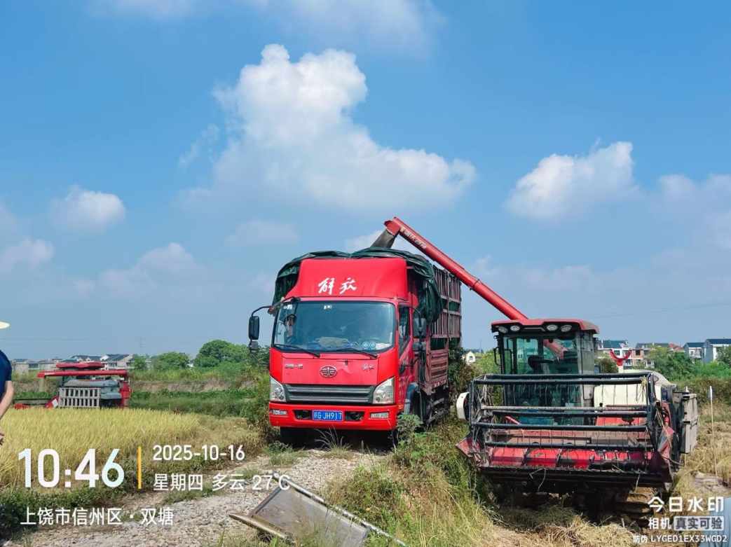 在田間,紅色的收割機正高效作業(yè),收割、脫粒等工序一氣呵成,隨后通過機械臂精準地將稻谷輸送至旁邊的卡車上?!耙郧叭斯な崭?,又累又慢,好幾天才能收完一片田?,F(xiàn)在有了農(nóng)機,輕松多了,效率特別高,這農(nóng)機真是咱們農(nóng)民種糧的‘好伙伴’!”小劉對農(nóng)機的便捷贊不絕口。