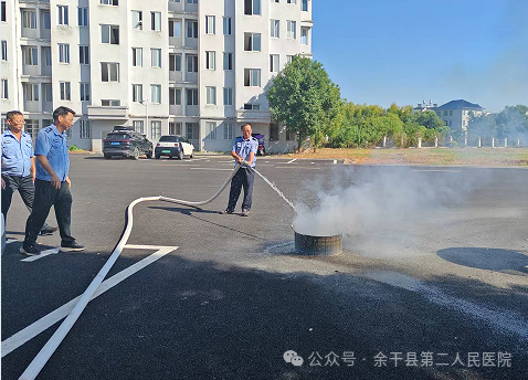 演練正式開始后,模擬住院部二樓外科因電器短路引發(fā)“火災”,煙霧報警器迅速響起。疏散引導組人員立即按照預定方案,引導患者及家屬捂住口鼻,彎腰低姿沿安全通道快速有序撤離。過程中,醫(yī)護人員全程陪伴行動不便的患者,使用輪椅協(xié)助轉(zhuǎn)移,確保不落下一人。僅用時 3分鐘,所有人員便安全疏散至指定集合點,疏散引導組隨即清點人數(shù)并向總指揮匯報。隨后,保安現(xiàn)場演示了滅火器“提、拔、握、壓” 的使用步驟,部分職工和安保人員主動上前實操,進一步鞏固滅火技能。