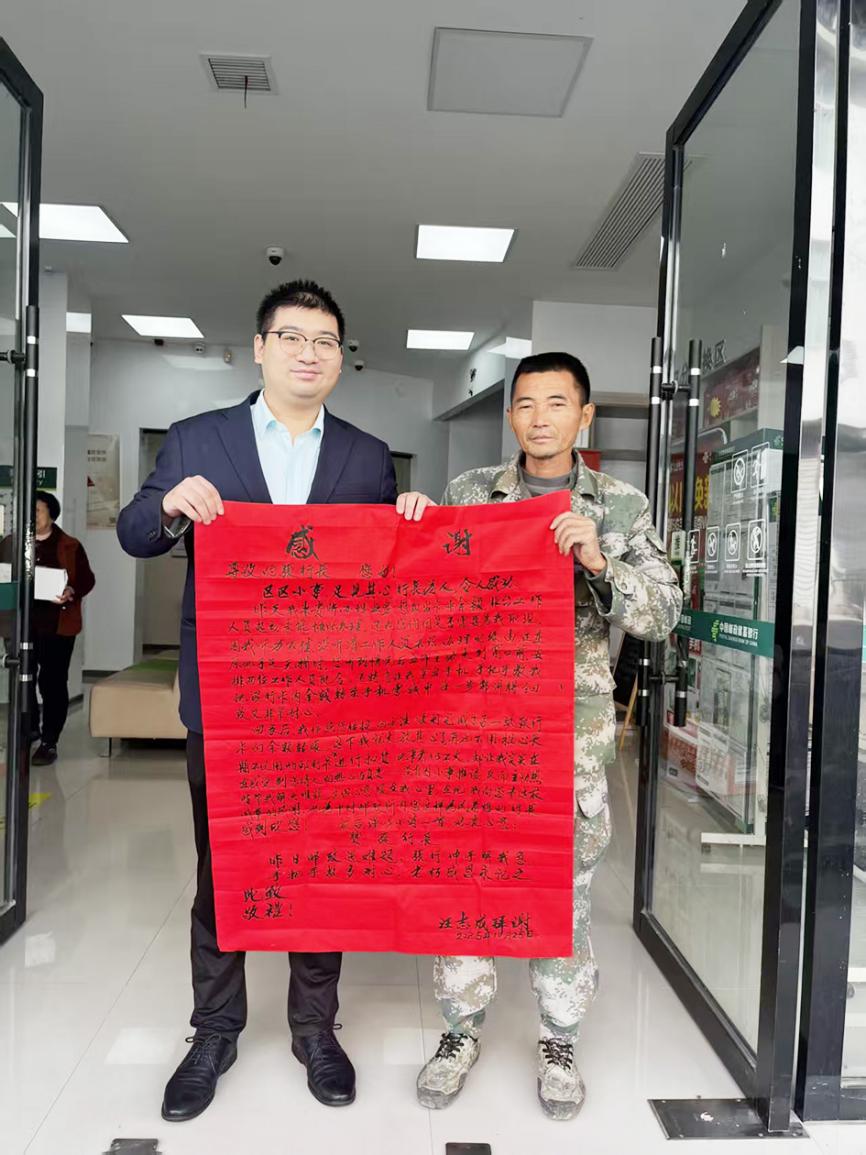回到家后,汪志成心里的暖意遲遲未散。他翻出紅紙,一筆一劃寫下感謝信:“區(qū)區(qū)小事,足見其心,行表在人,令人感動……昨日郵政遇難題,張行伸手解我急。手把手教多耐心,老朽感恩永記之?!辟|(zhì)樸的字句里,滿是對郵政工作人員的認可。