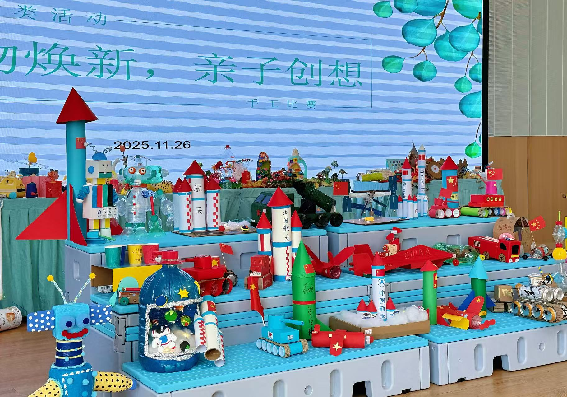 本次活動家長與孩子們攜手創(chuàng)作,利用紙箱、塑料瓶、舊布料等日常廢棄材料,制作出各式各樣的創(chuàng)意作品。有的家庭用紙箱搭建出迷你垃圾分類站,有的用礦泉水瓶組裝成精美花瓶,還有的將奶粉罐變身成中國航天火箭。幼兒園還舉辦了小型的作品展示會。孩子們自豪地介紹著自己和家人的創(chuàng)作,一件件充滿想象力的作品,不僅是親子智慧的結(jié)晶,更成為了宣傳環(huán)保理念最生動的載體。