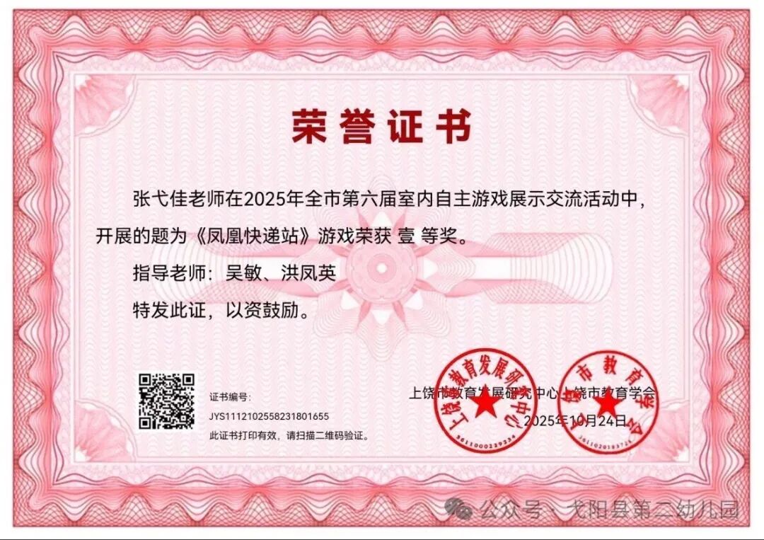 近日,弋陽縣第二幼兒園張弋佳教師在上饒市教育發(fā)展研究中心聯(lián)合教育學(xué)會主辦的“上饒市第六屆幼兒園室內(nèi)自主游戲展示交流活動”中,憑借出色的教學(xué)設(shè)計與實踐表現(xiàn),榮獲一等獎。