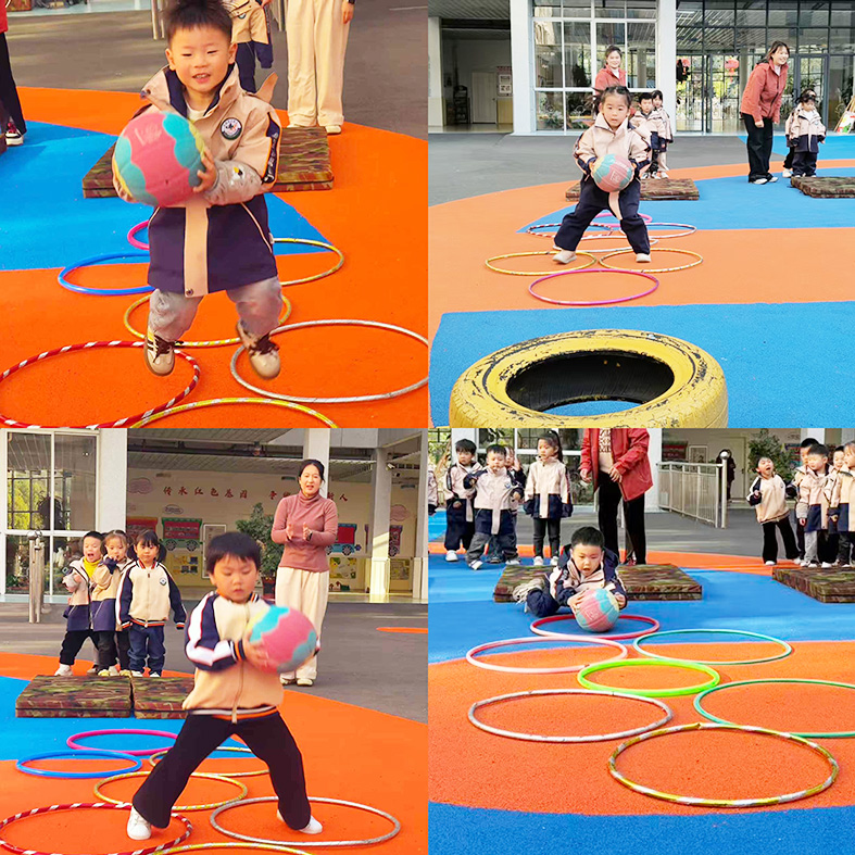 小班的競(jìng)賽以“輕松趣味”為核心,設(shè)置了“翻滾“呼啦圈跳”“趣味投擲”三個(gè)簡(jiǎn)單關(guān)卡。簡(jiǎn)單的挑戰(zhàn)不僅鍛煉了孩子們的肢體協(xié)調(diào)性,更讓他們?cè)谟螒蛑薪⒘俗孕拧?/p>