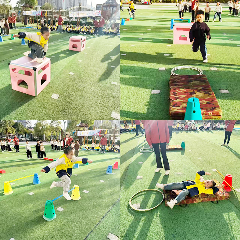 中班的“快樂(lè)闖關(guān)”環(huán)節(jié)包含“匍匐前進(jìn)”“障礙平衡木”“折返跑”三個(gè)項(xiàng)目。孩子們?cè)诒蚯蛸橘肭斑M(jìn)過(guò)程中小心翼翼,在平衡木上穩(wěn)步前行,折返跑中游刃有余。整個(gè)過(guò)程充滿(mǎn)了歡聲笑語(yǔ)。