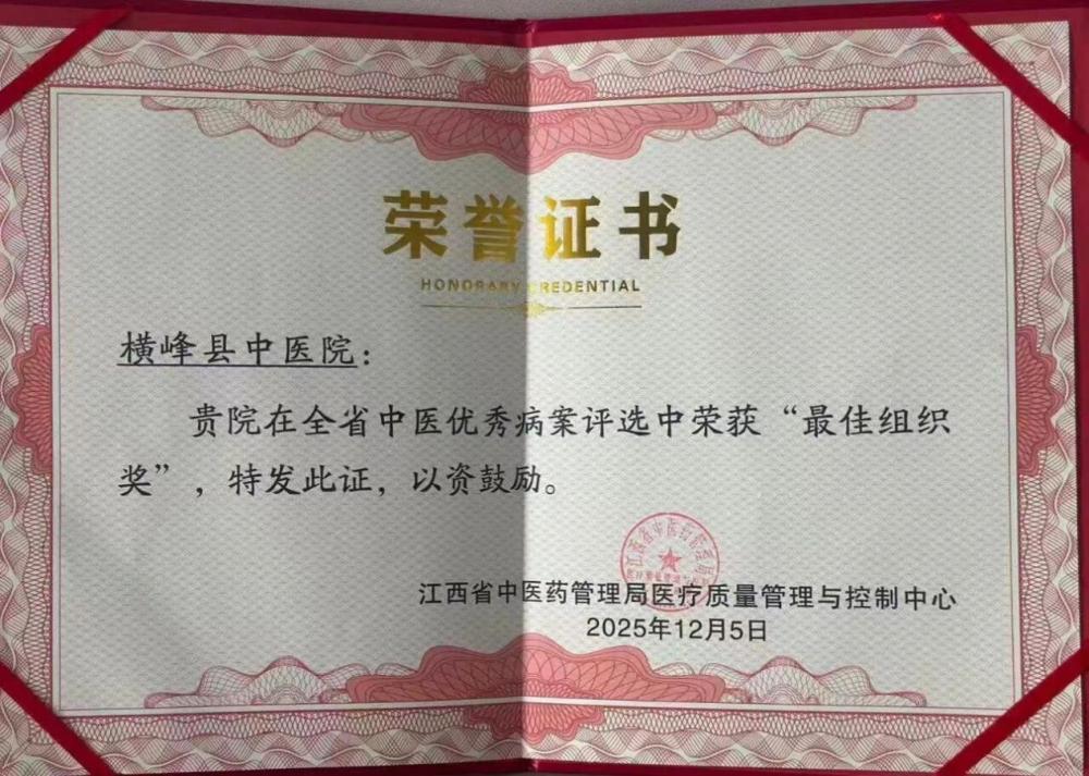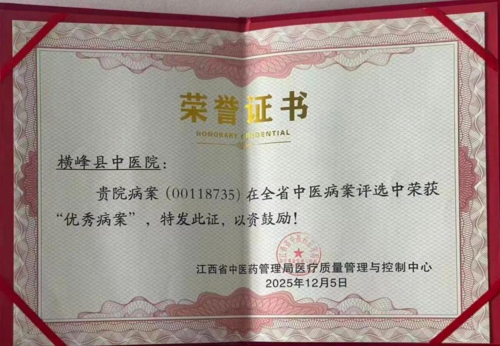 近日,在江西省中醫(yī)醫(yī)療質(zhì)量管理與控制中心舉辦的全省中醫(yī)優(yōu)秀病歷評(píng)選活動(dòng)中,橫峰縣總醫(yī)院中醫(yī)院院區(qū)針灸康復(fù)科選送的病歷榮獲“優(yōu)秀病案”獎(jiǎng),醫(yī)院獲評(píng)“最佳組織獎(jiǎng)”。