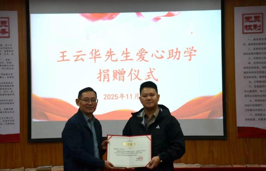 儀式上,學校相關(guān)領導領導代表全校師生對王云華先生的慷慨善舉致以熱烈歡迎和衷心感謝。他表示,此次捐贈不僅為貧困學子帶來了物質(zhì)上的幫扶,更傳遞了社會溫情與關(guān)懷,為全校師生注入了精神動力,將激勵學校持續(xù)深耕教育、培育棟梁。
