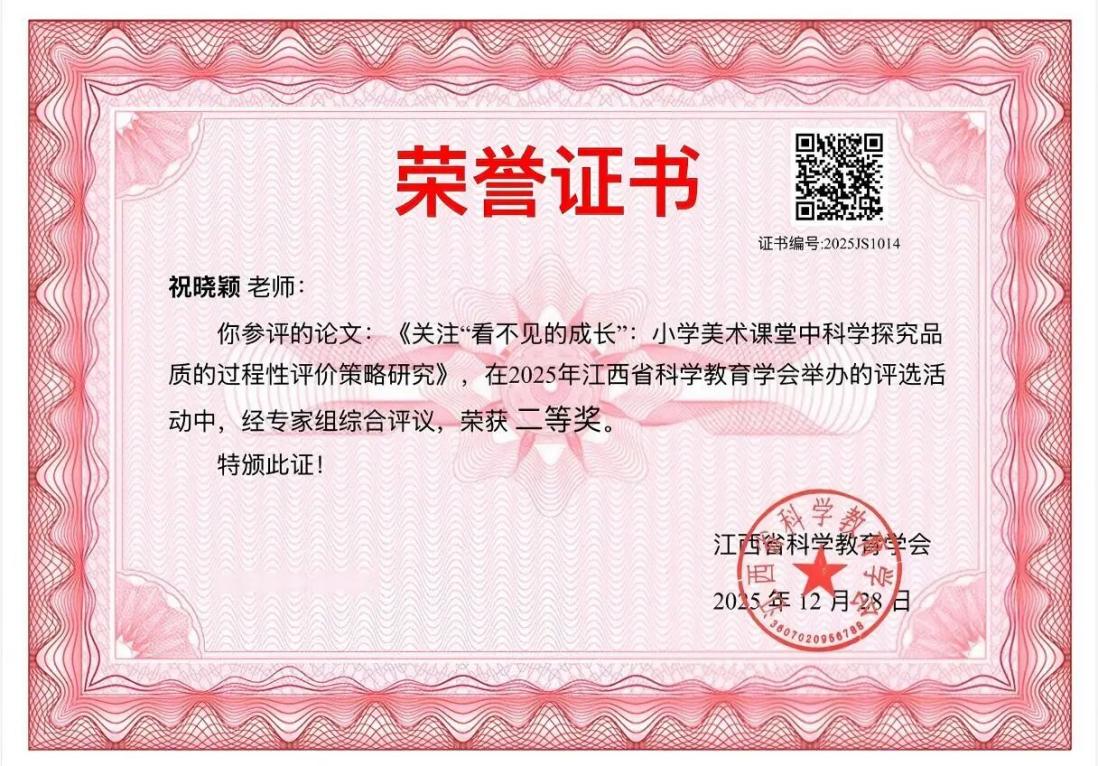 該校祝曉穎老師撰寫(xiě)的論文《關(guān)注“看不見(jiàn)的成長(zhǎng)”:小學(xué)美術(shù)課堂中科學(xué)探究品質(zhì)的過(guò)程性評(píng)價(jià)策略研究》憑借新穎的研究視角、扎實(shí)的論證過(guò)程與實(shí)用的實(shí)踐價(jià)值,榮獲江西省二等獎(jiǎng),充分彰顯了學(xué)校教師在教育教學(xué)研究領(lǐng)域的深厚積淀與創(chuàng)新探索精神。