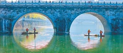 1月15日,江西省宜春市宜豐縣耶溪河橋西鄉(xiāng)段,河長(zhǎng)和河道保潔員在水面上進(jìn)行清漂護(hù)水作業(yè)。