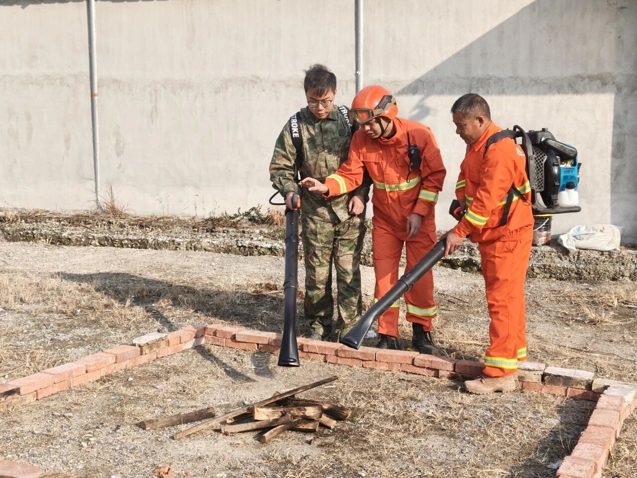 演練集結(jié)區(qū),鄉(xiāng)村半專業(yè)撲火隊、交通管控組、信息組、火場管控組及后勤保障組整齊列隊。整隊完畢后,鄉(xiāng)總指揮長宣布演練正式開始??h應急管理局專業(yè)指導員率先開展裝備操作標準化演示,細致講解風力滅火機的背負、啟動及風向操控技巧,示范電鋸安全使用與防火隔離帶開辟流程,重點演練消防水帶鋪設、接口連接、壓力控制及協(xié)同滅火站位等關(guān)鍵環(huán)節(jié),確保隊員熟練掌握實操技能。