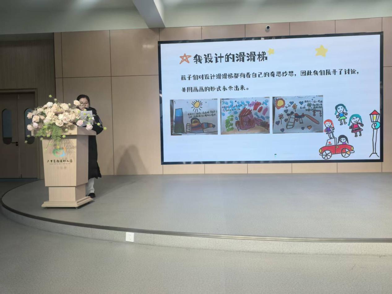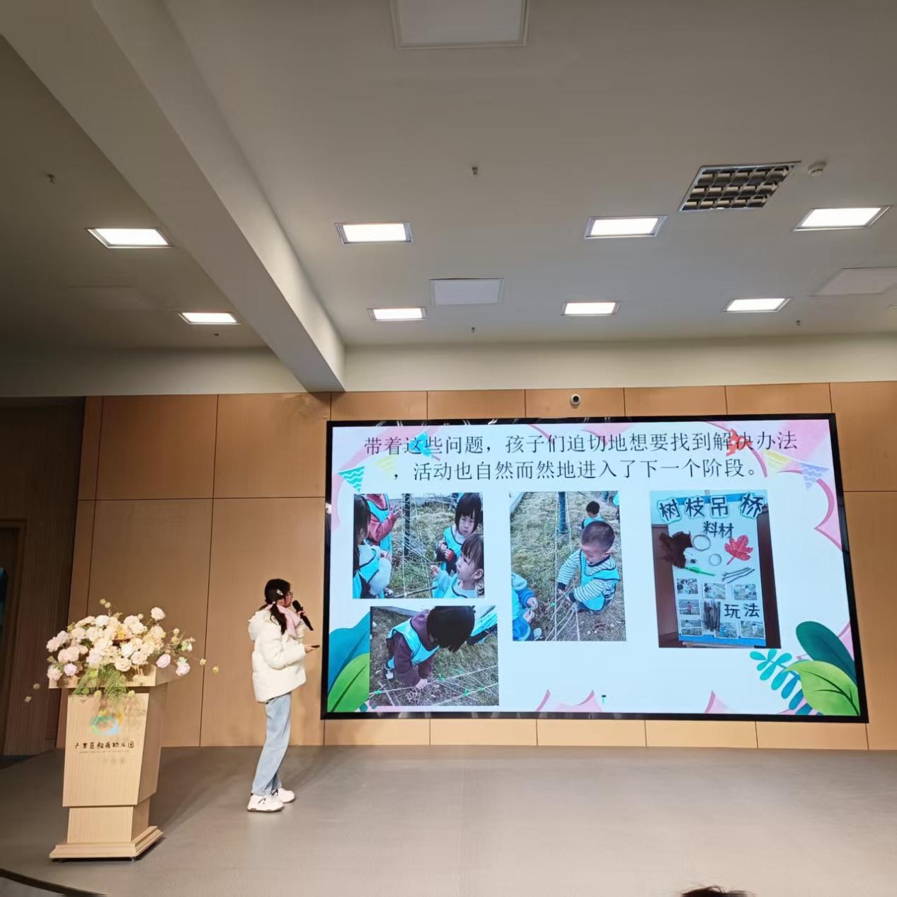 活動現(xiàn)場,各班級教師結(jié)合游戲?qū)嶄洝F(xiàn)場視頻與觀察反思,詳細分享了各類戶外自主游戲的生成背景、發(fā)展過程與教育成效。“安吉梯變形記”中,孩子們化身“小小工程師”,自主搭配木梯、木板與安吉箱,在反復(fù)嘗試、不斷調(diào)整中,搭建出空中棧道、創(chuàng)意坦克等多樣造型,在協(xié)作互助中錘煉動手能力,在試錯探索中提升問題解決能力。