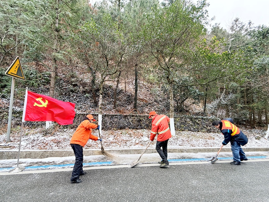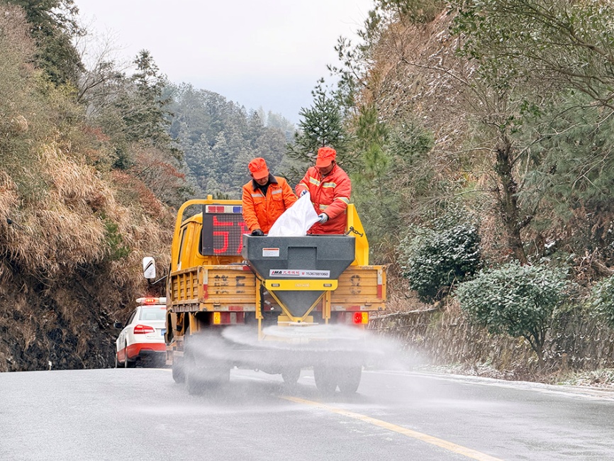 險(xiǎn)情就是命令,暢通就是責(zé)任。上饒市三清山公路事業(yè)發(fā)展中心第一時(shí)間啟動公路應(yīng)急除冰預(yù)案,迅速集結(jié)養(yǎng)護(hù)職工、機(jī)關(guān)骨干共20人,組建應(yīng)急搶通隊(duì)伍,攜帶融雪劑、撒鹽機(jī)等應(yīng)急物資設(shè)備奔赴現(xiàn)場?,F(xiàn)場累計(jì)出動應(yīng)急搶險(xiǎn)車輛4臺、撒鹽機(jī)1臺,作業(yè)人員分工協(xié)作、高效聯(lián)動,有序開展撒布融雪劑、破冰除障等作業(yè),累計(jì)使用融雪劑2噸,全力清除路面冰雪。