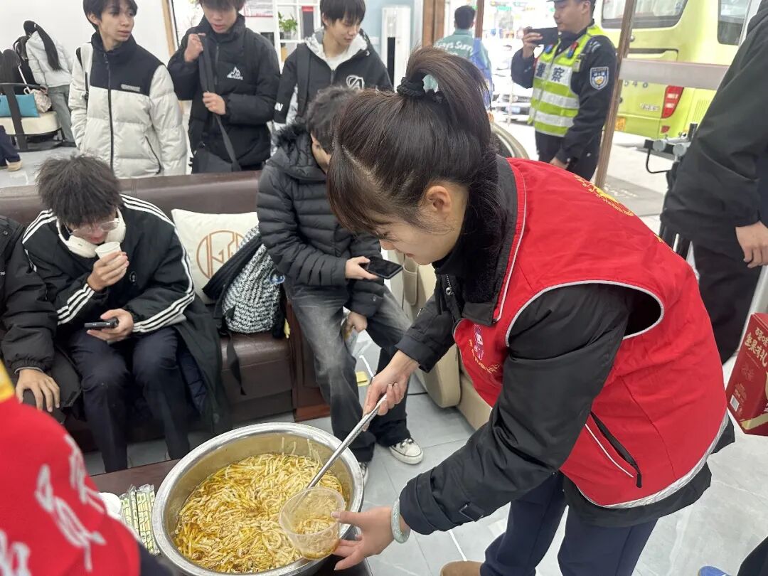 接到通知后,值班站長立即啟動(dòng)應(yīng)急處置預(yù)案,依托工會(huì)驛站與員工食堂兩大服務(wù)陣地,迅速組織工作人員開展接待準(zhǔn)備工作。站內(nèi)開放工會(huì)驛站供孩子們休息取暖,同時(shí)啟用員工食堂緊急備餐,為51名學(xué)生端上熱氣騰騰的面條,遞上暖心暖胃的姜茶。