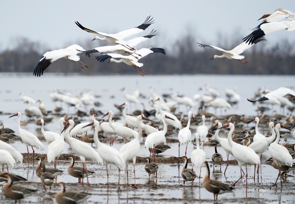 這是2月27日在江西上饒市余干縣白鶴洲拍攝的白鶴等候鳥。