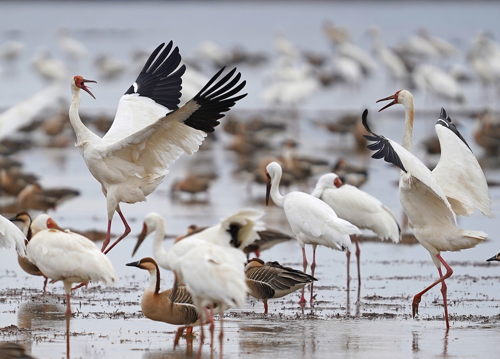 初春時節(jié),上千只白鶴齊聚鄱陽湖畔的江西省上饒市余干縣白鶴洲棲息覓食。它們時而凌空飛舞,時而灘涂嬉戲,構(gòu)成一幅生機(jī)盎然的生態(tài)畫卷。新華社記者 萬象 攝