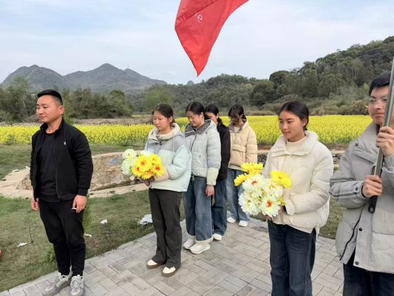 線下,師生代表齊聚烈士紀念碑前,舉行莊重祭奠儀式:全體肅立唱國歌、默哀一分鐘,學生代表敬獻花束,團委書記黃潔深情講述英烈事跡,全體人員莊嚴宣誓“請黨放心,強國有我”,并有序瞻仰墓碑、擦拭碑文,接受愛國主義洗禮。
