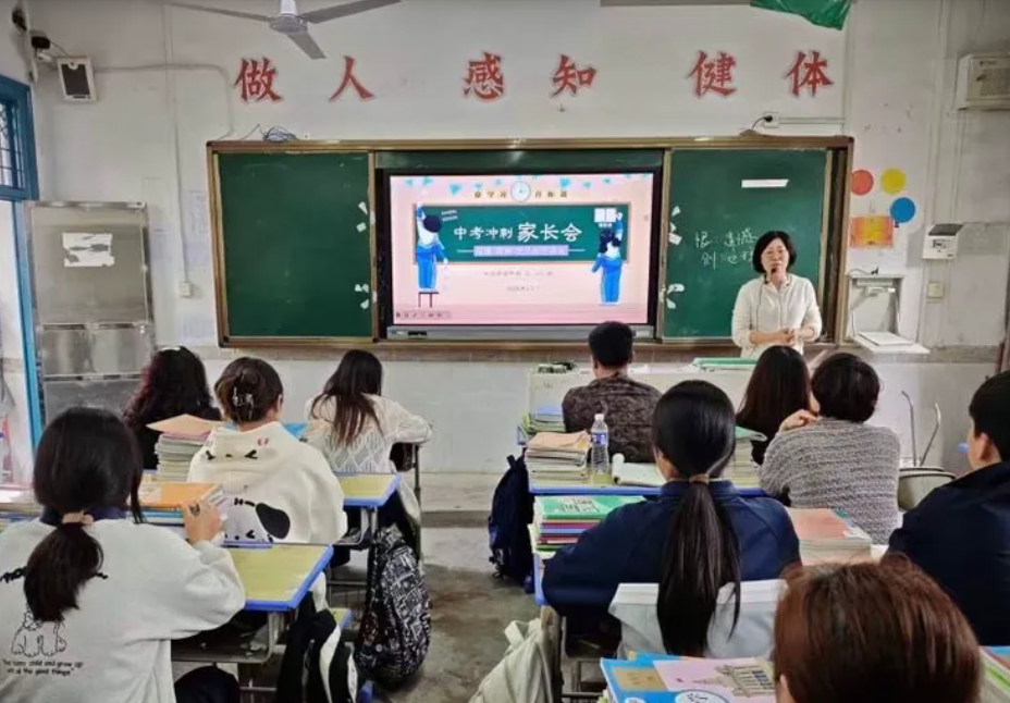 第一階段為校級(jí)統(tǒng)籌,明確備考方向。家長(zhǎng)與學(xué)生提前入場(chǎng),齊聚學(xué)校報(bào)告廳,聆聽學(xué)校負(fù)責(zé)人講話,詳細(xì)了解九年級(jí)備考整體規(guī)劃、當(dāng)前中考形勢(shì)及家校協(xié)同要求,為沖刺階段統(tǒng)一思想、錨定方向。學(xué)校負(fù)責(zé)人連續(xù)多次與各班家長(zhǎng)交流,家長(zhǎng)參與度高,溝通效果顯著。