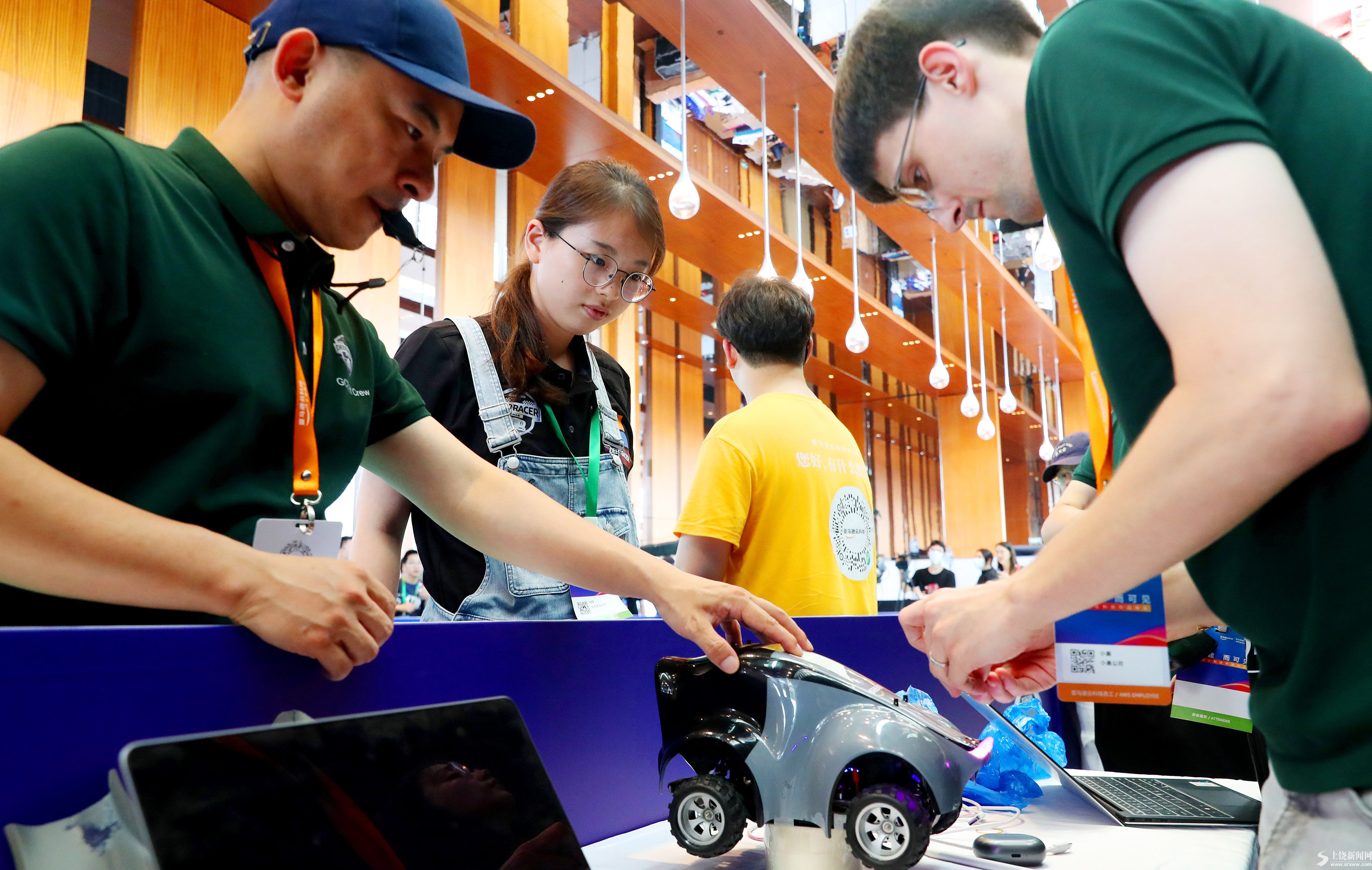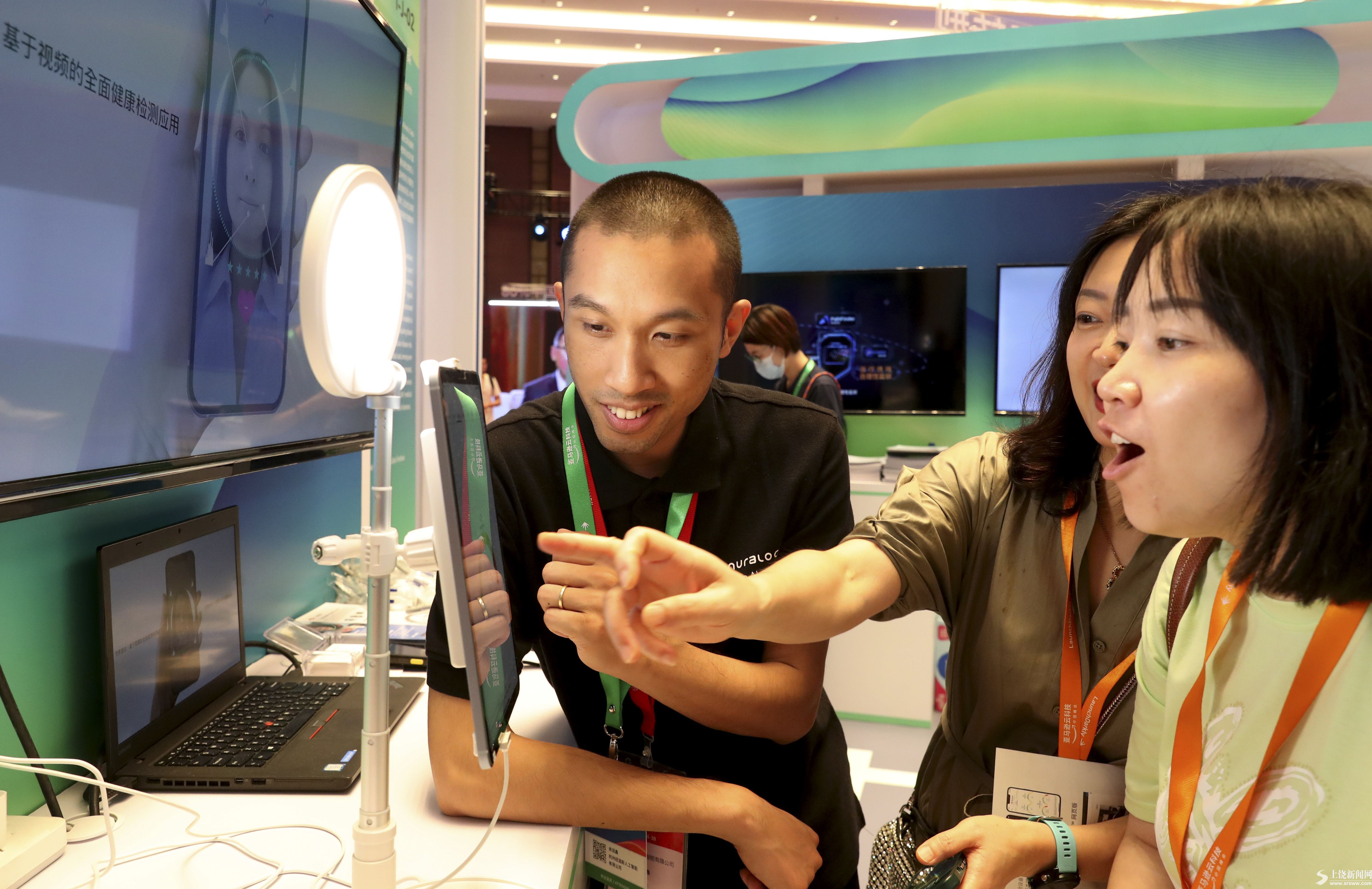 6月28日,參觀者在峰會展示區(qū)內(nèi)的一個(gè)智能駕駛座艙展位前交流討論。
