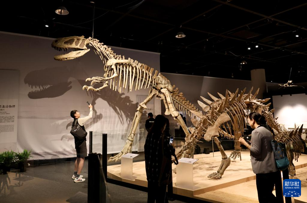 5月26日,參觀者在一組恐龍群落化石展品前駐足。