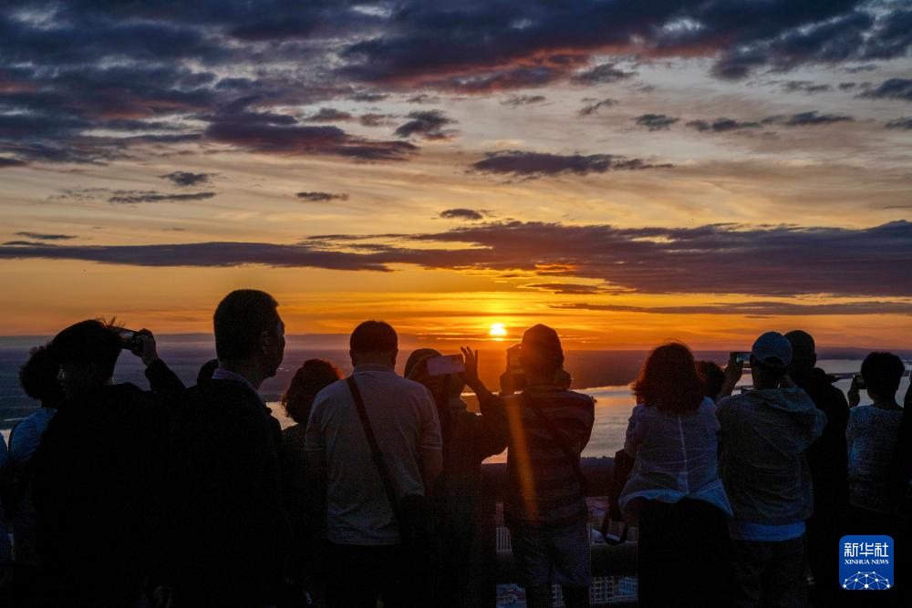 7月4日,游客在黑龍江撫遠(yuǎn)市東極閣拍攝年度“最小太陽”。