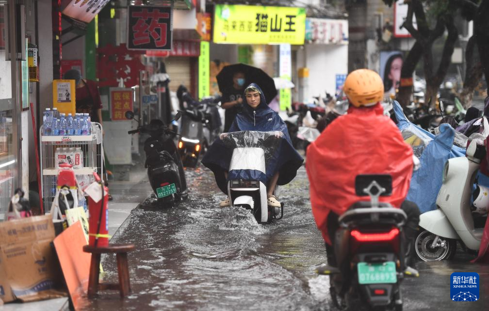 7月20日,在??谑薪瘕埪?,外賣騎手騎電動車通過積水路段。
