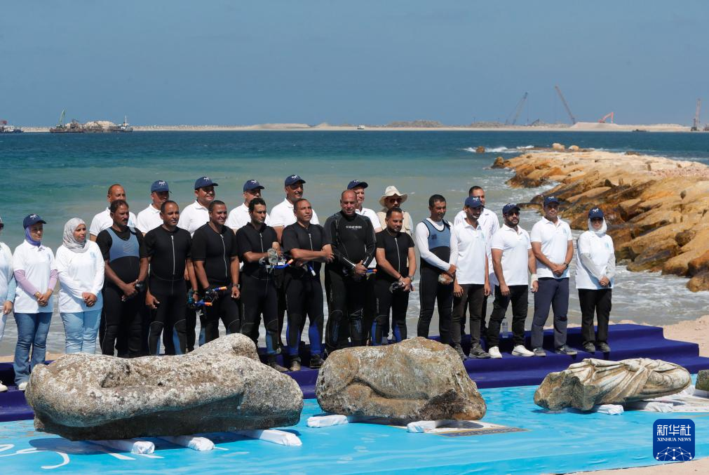 8月21日,在埃及亞歷山大附近的海濱,文物工作者和打撈隊(duì)員與打撈出水的石刻雕像合影。