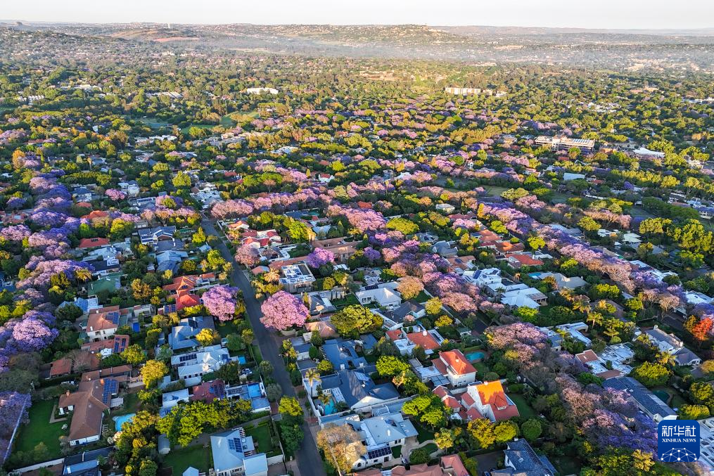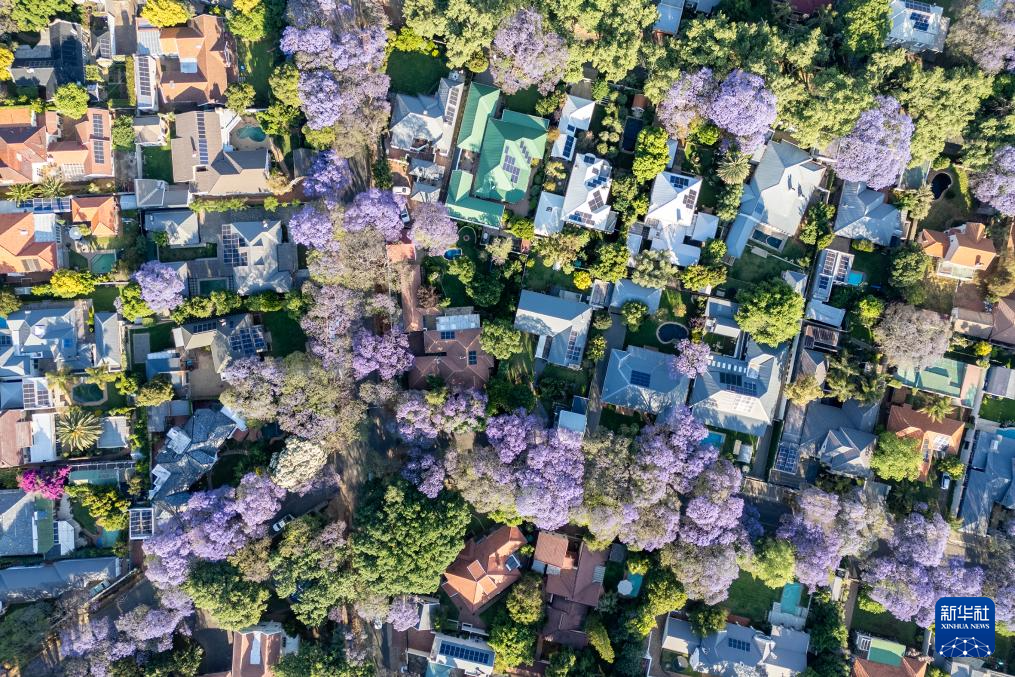 這是10月16日在南非約翰內(nèi)斯堡拍攝的盛開的藍(lán)花楹(無人機照片)。