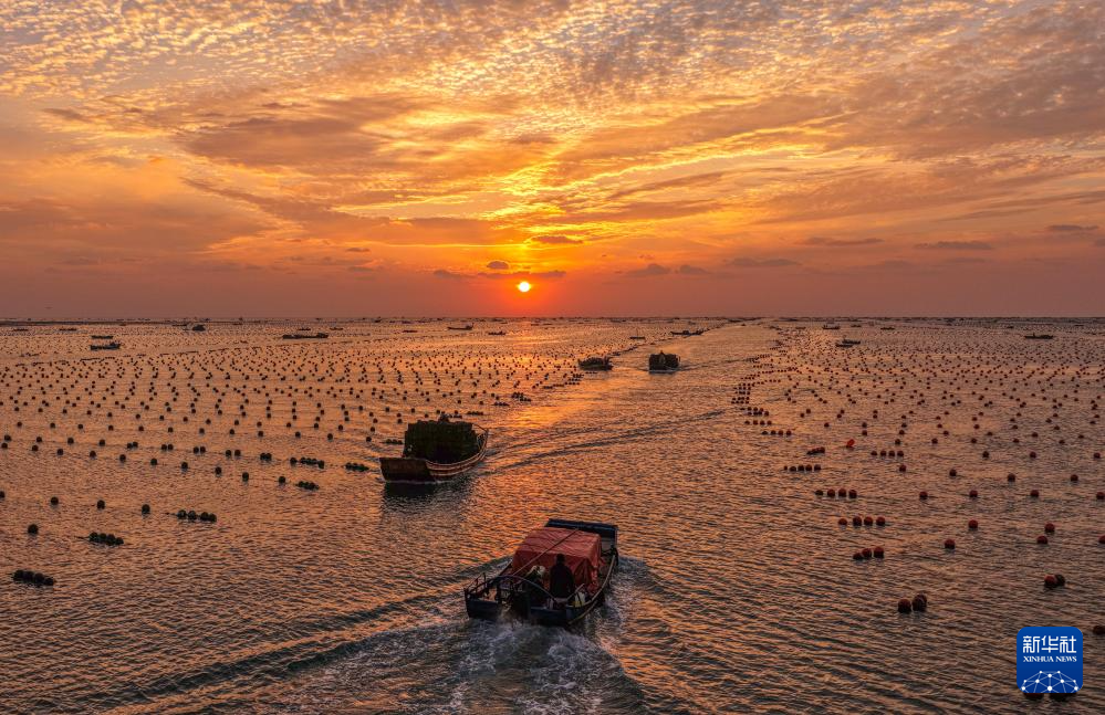 10月24日,在榮成市愛(ài)倫灣鮑魚(yú)養(yǎng)殖區(qū),收獲鮑魚(yú)的養(yǎng)殖戶(hù)駕駛船只返回漁港(無(wú)人機(jī)照片)。