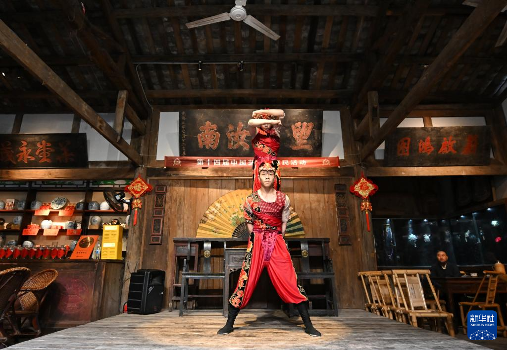 10月25日,作為第十四屆中國藝術節(jié)惠民活動,沈陽雜技演藝集團的雜技演員在成都金琴老茶館上演雜技節(jié)目《男子對手》。