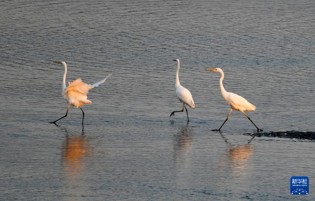 11月4日,在黑龍江省牡丹江市江心島附近的江灘淺流中,白鷺在覓食。